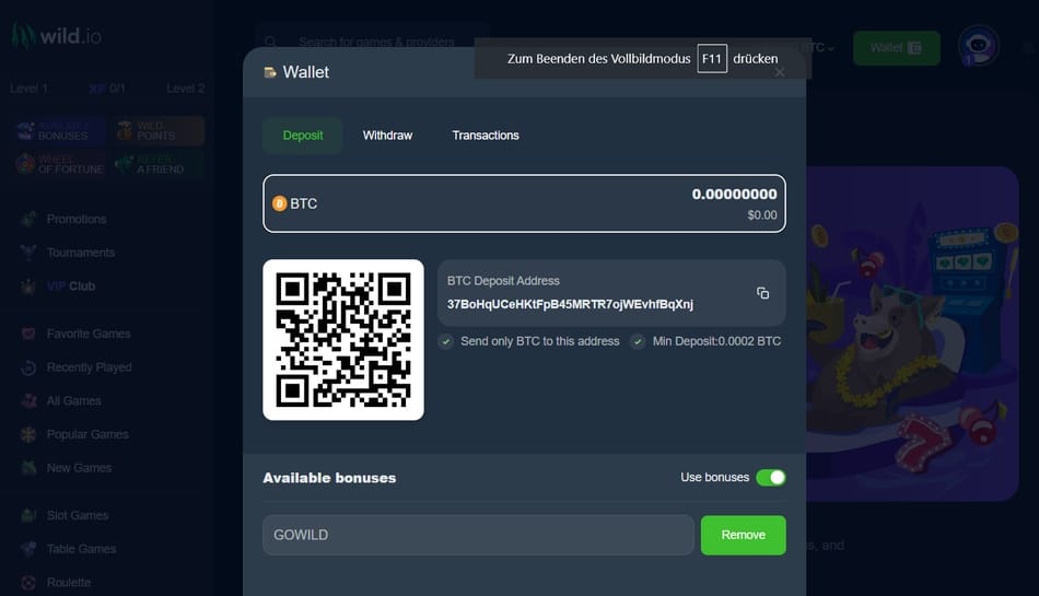 Bonusgutschrift: Nach Abschluss der Einzahlung wird der Bonusbetrag (150% bis zu 1,5 BTC) automatisch Ihrem Spielerkonto gutgeschrieben. Zusätzlich erhalten Sie 100 Freispiele, die ebenfalls Ihrem Konto hinzugefügt werden.