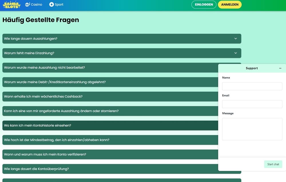 Der Samba Slots Support ist am einfachsten über den Live Chat auf der Webseite zu erreichen. Dieser steht grundsätzlich rund um die Uhr zur Verfügung. Bei unserem Test dauerte es jedoch ein paar Minuten, bis sich jemand mit uns beschäftigte.