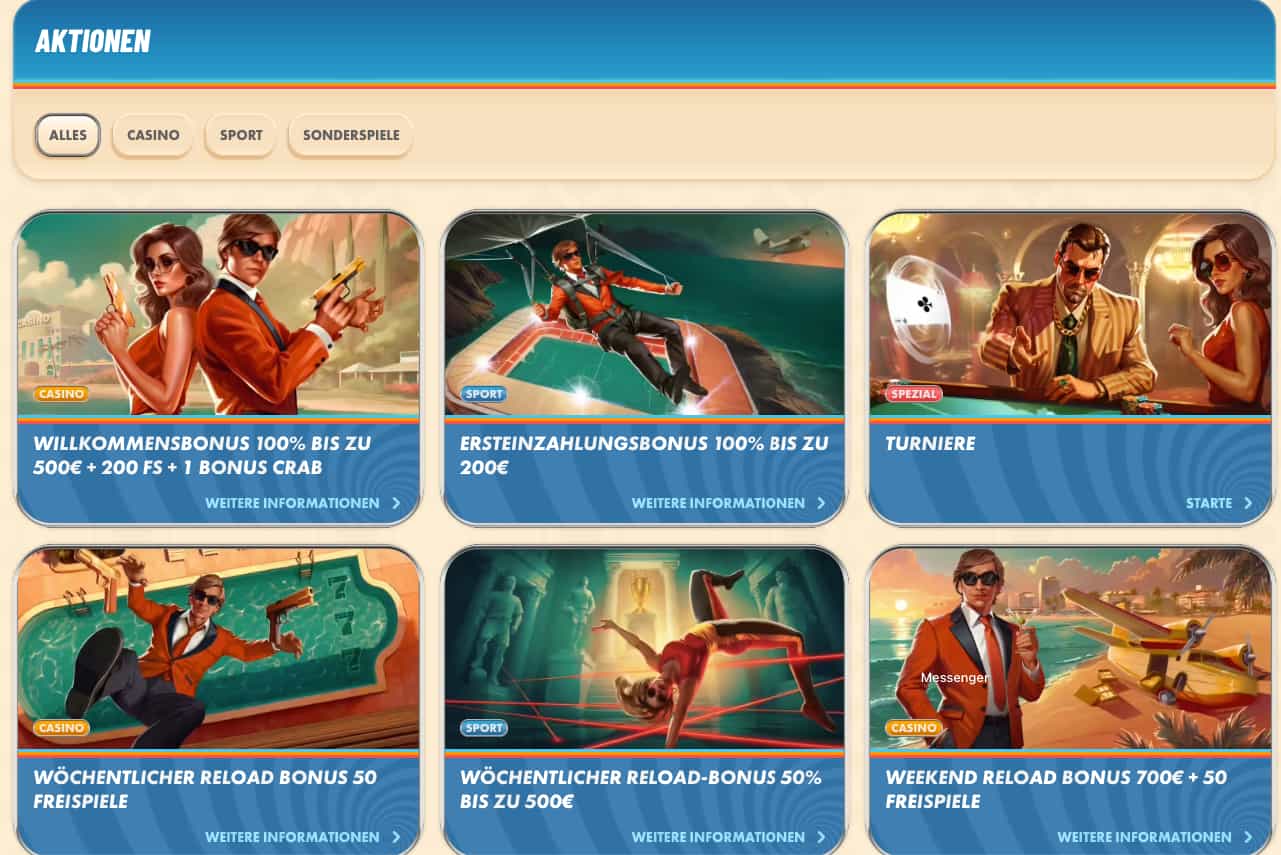 Der Vegasino Einzahlungsbonus für neue Kunden ist gut und beschert Ihnen bis zu 500 € + 200 Freispiele sowie eine Bonus-Krabbe. Obwohl die Umsatzanforderungen recht anspruchsvoll ausfallen, sorgt der Vegasino Neukundenbonus für einen leichten Start.