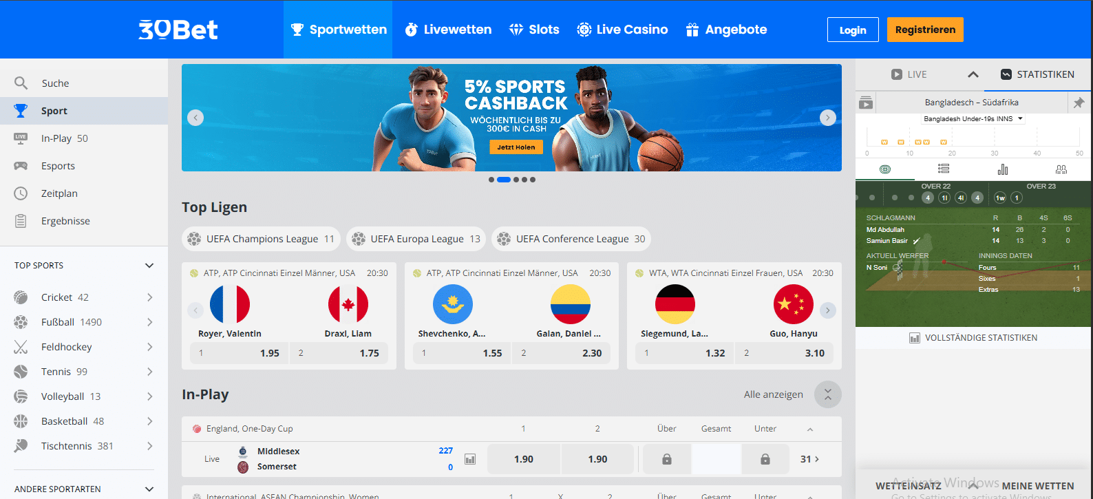 Im Fußball, getestet anhand eines Spiels der Premier League, lag 30Bet etwas hinter der Konkurrenz. Beim Tennis, wo wir mehrere Partien der US Open ausgewertet haben, zeigte sich ein ähnliches Bild mit soliden Werten, aber leicht unter dem Durchschnitt. Auch bei den Live-Wetten (am Beispiel Tischtennis) fiel 30Bet knapp zurück.