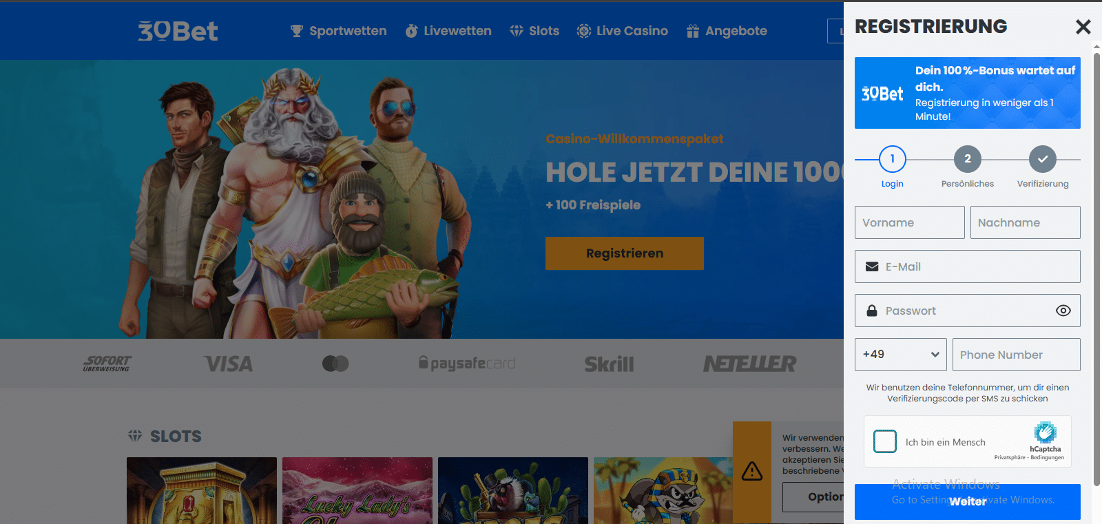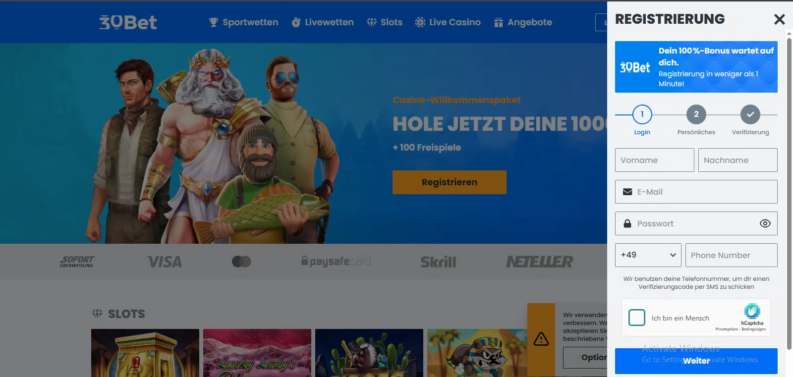 Die Registrierung bei 30Bet ist unkompliziert und in wenigen Schritten erledigt. Um Fake-Accounts auszuschließen, erfolgt eine Verifizierung per SMS-Code.