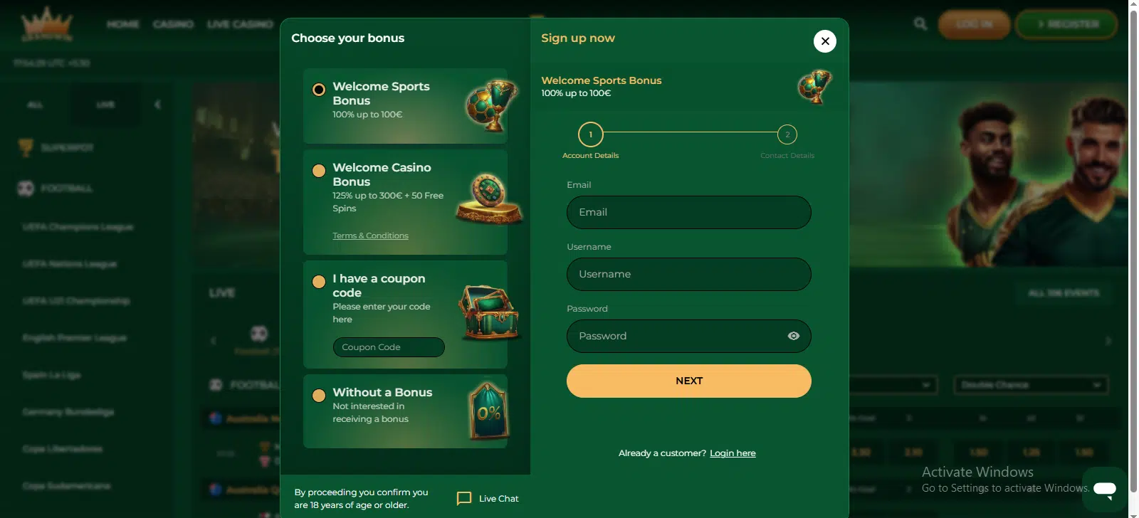 Der erste Schritt ist die Registrierung. Auf der Webseite ist oben rechts der Button „Anmelden“ zu finden. Potentielle Kunden werden zum zweiteiligen Registrierungsformular geführt. Am linken Bildrand ist die aktuelle Grandwin Bonus-Auswahl zu sehen. Entscheiden Sie sich für den Sportwetten Bonus. Geben Sie rechts daneben Ihre E-Mail-Adresse ein, legen Sie einen Spielernamen und ein Passwort fest.