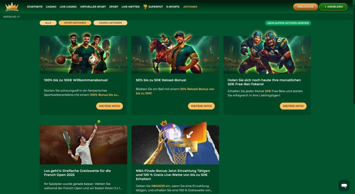 Neue Kunden starten mit einem 100% bis 100 € Grandwin Neukundenbonus. Der Wettbonus muss vor der Auszahlung 16 Mal umgesetzt werden.