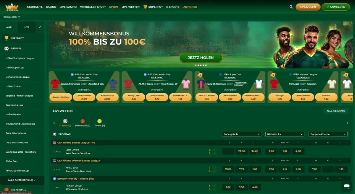 Das Sportwettenangebot muss sich hinter keinem alteingesessenen Buchmacher verstecken. Grandwin Livewetten und Pre-Match-Angebote sind konkurrenzfähig. Mit mindestens 35 Sportarten pro Tag im Wettprogramm bleiben keine Wettwünsche offen.