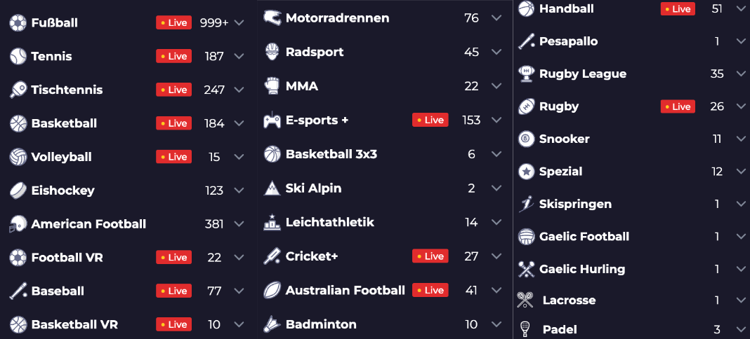 Riesige Wettauswahl mit über 30 Disziplinen (Pre-Match & Live); ohne OASIS (ausländische Lizenz); mobil optimiert.