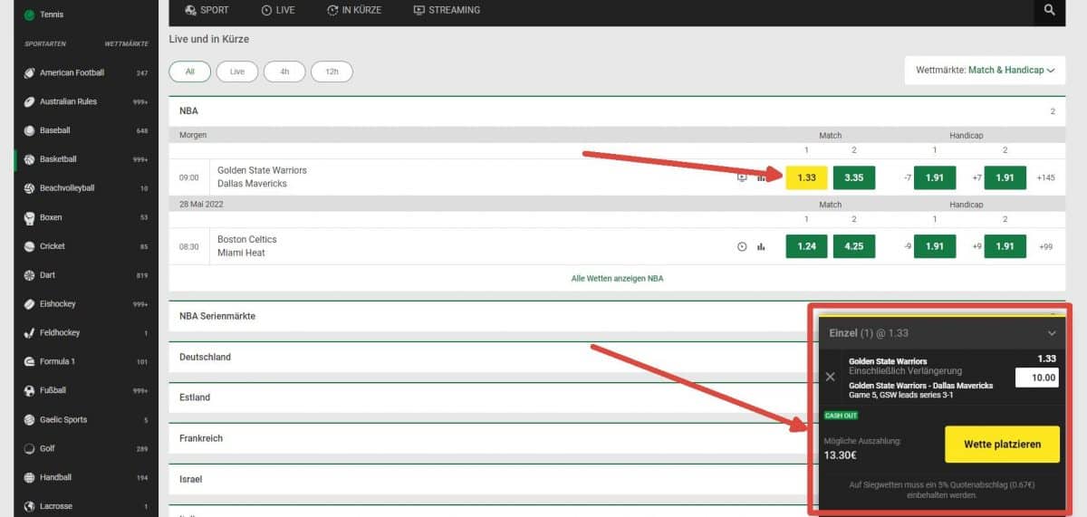 Bereits bei der Abgabe Ihrer Sportwette steht fest, wie viel Geld Ihnen bei einem Gewinn gutgeschrieben wird. Um zu sehen, wie hoch die Gewinnauszahlung ausfällt, multiplizieren Sie einfach Ihren Einsatz mit der Quote. Bei den meisten Wettenanbietern wird bei der Eingabe des Einsatzes direkt angezeigt, wie hoch der Gewinn ausfällt.